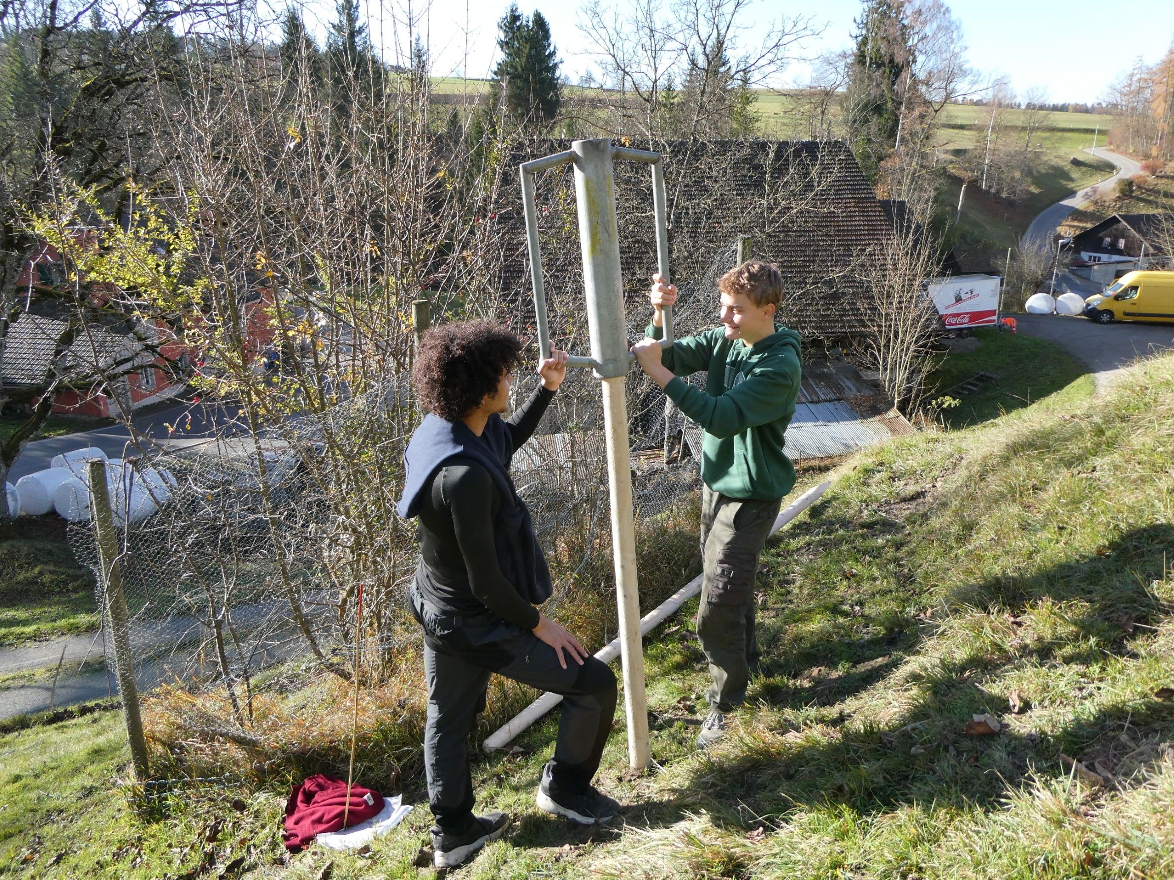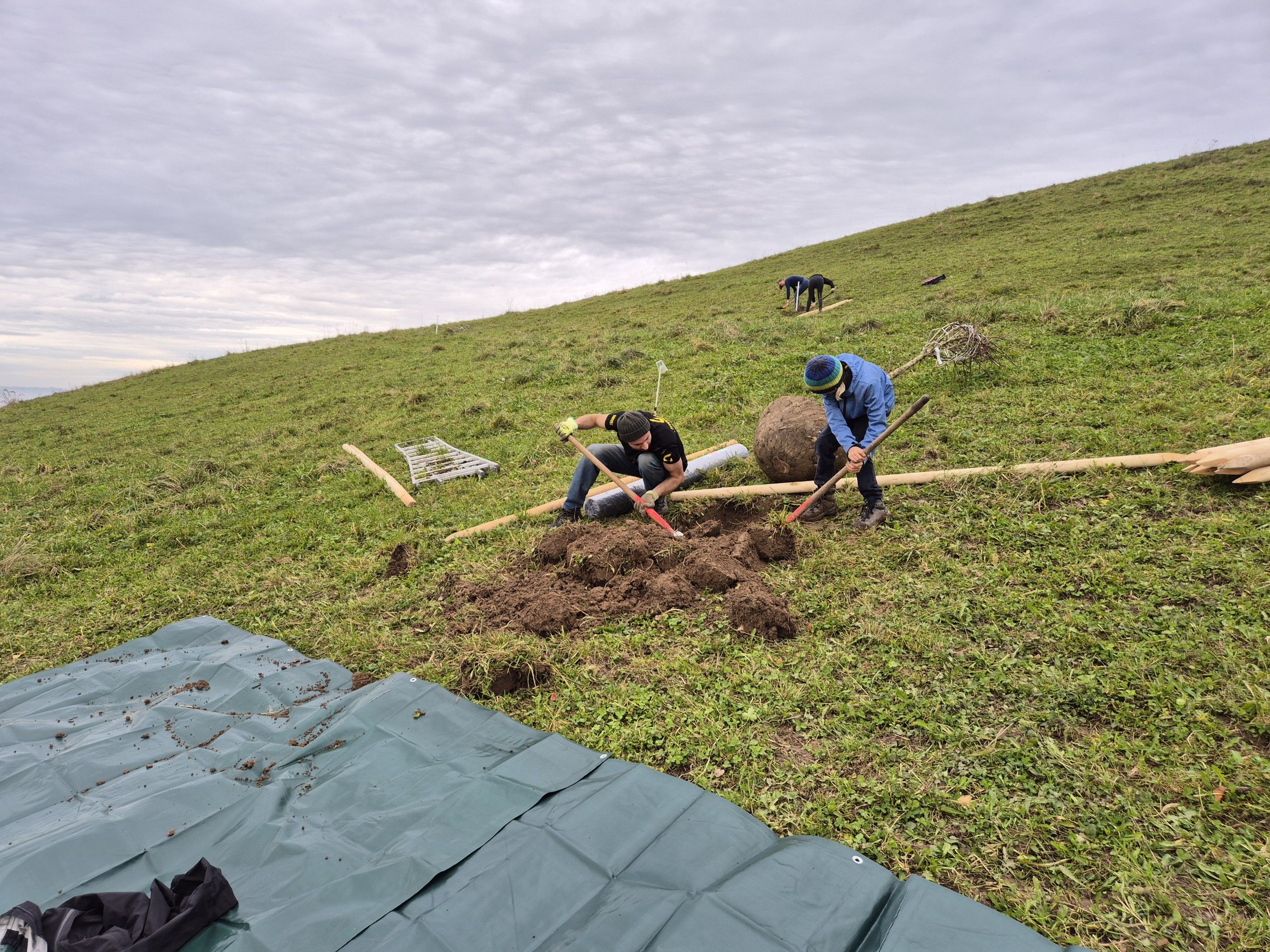 Gemeinsam pflantzen die Freiwilligen unter Anleitung des Naturnetz Pfannenstil und des Landwirten Obstbäume und eine Hecke. Zum Schutz der Hecke wurde ein Zaun gebaut. Als Ergänzung zur Hecke legten die motivierten Teilnehmenden Ast- und Steinhaufen an.