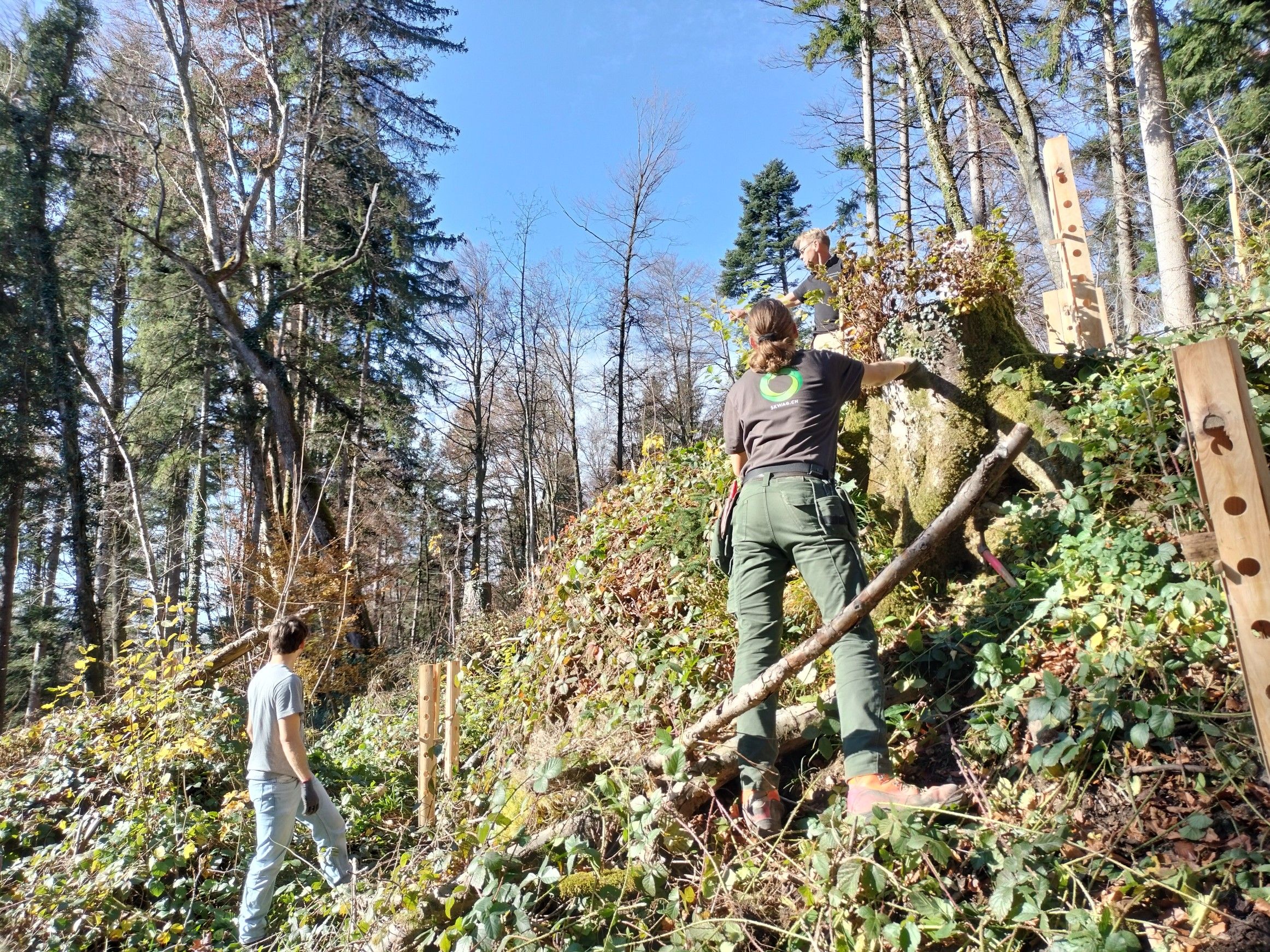 Mit grossem körperlichem Einsatz wurden kleine Bäume gefällt, Asthaufen gebildet, Steinhaufen gelegt und gebietsfremde Pflanzen (Neophyten) ausgerissen. Die schweisstreibende Arbeit wurde mit einem von der Gemeinde Egg offeriertem gemeinsamen Mittagessen und mit dem Gedanken belohnt, für das Rote Waldvögelein - eine geschützte Orchidee - und verschiedene Vogel- und Insektenarten ein kleines Paradies geschaffen zu haben.