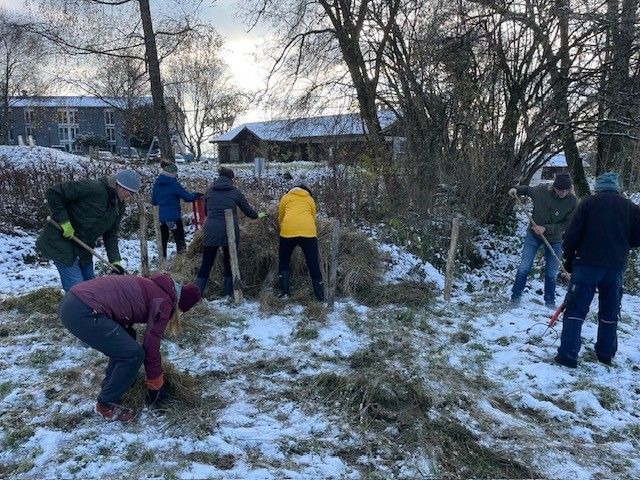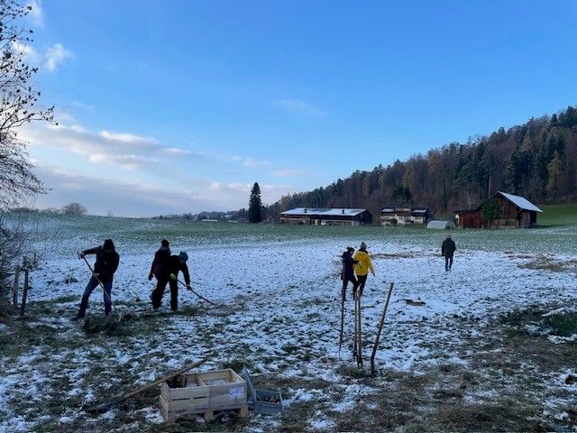 Trotz kalter Witterung und etwas Schnee trafen sich am 22. November 2025 engagierte Helfer:innen, um das Feuchtbiotop Boldern zu pflegen: Schnittgut wurde zu wertvollen Haufen für die Ringelnatter zusammengerecht, invasive Gehölze entfernt und neue Asthaufen für allerlei Tiere angelegt. Auch einige Wasserpflanzen fanden Platz beim Weiher. Zum Abschluss gab es im warmen Besuchsraum der Anna Zemp-Stiftung ein feines Chili sin Carne und die Helfer:innen konnten den Nachmittag gemütlich ausklingen lassen.
